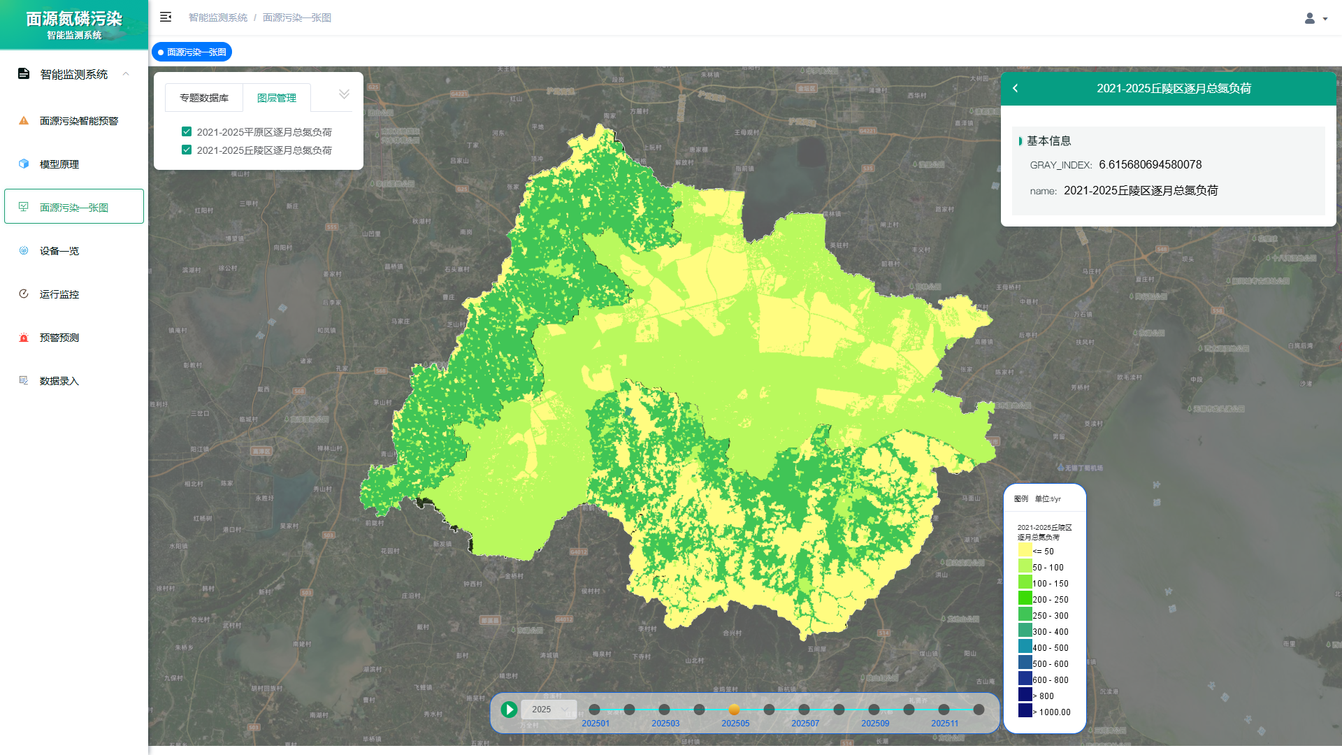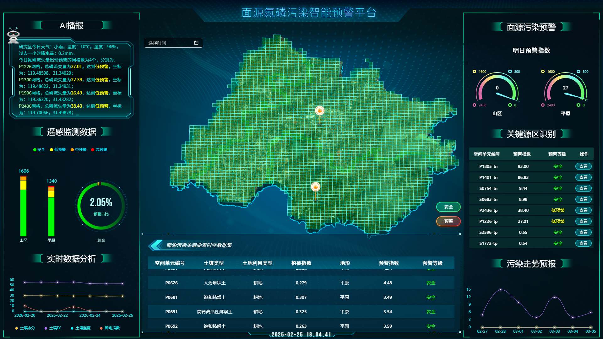 为破解我国地表水环境治理中面源污染精准识别与动态管控的难题,提升流域环境治理智能化水平,中国科学院南京地理与湖泊研究所首创了面向太湖流域多源区类型(水田、养殖塘、旱地、茶园等)精准识别与动态追踪的“数据-模型-预警”一体化大数据管理与预警平台。该系统在构建形成包括流域水文气象、土地利用、土壤环境、植被及多源遥感和在线传感在内的海量基础数据基础上,自主研发兼顾山区与平原特点的面源氮磷输移全过程时空追溯模型并集成在大数据平台中,实现了四类污染源区、三十余个关键地块的智慧化识别与追踪;并研制以气象预报原理为支撑的AI研判模拟技术,对污染高风险源区进行高频预警与客户端推送。